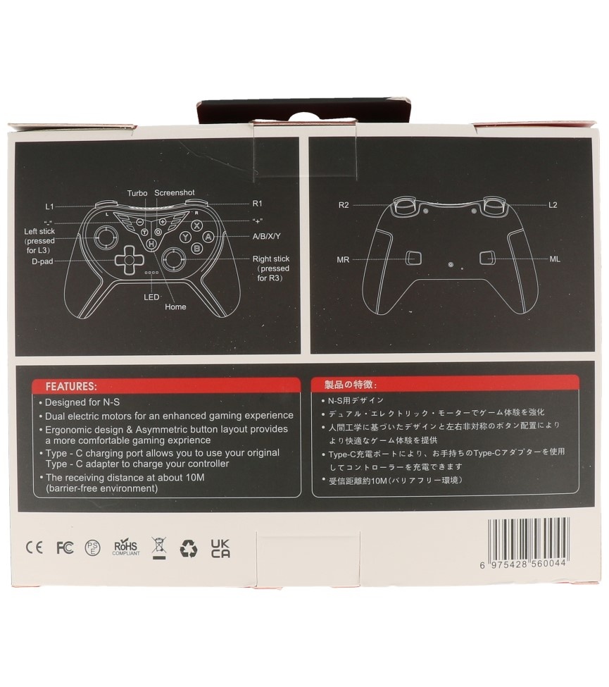 Dit product is een Switch draadloze Bluetooth-controller met Hall-effect joystick (met gebruik van draadloze Bluetooth-technologie). Het maakt bediening op afstand mogelijk over langere afstand, is eenvoudig te gebruiken en geschikt voor de Switch-, Switch OLED- en Switch Lite-console.